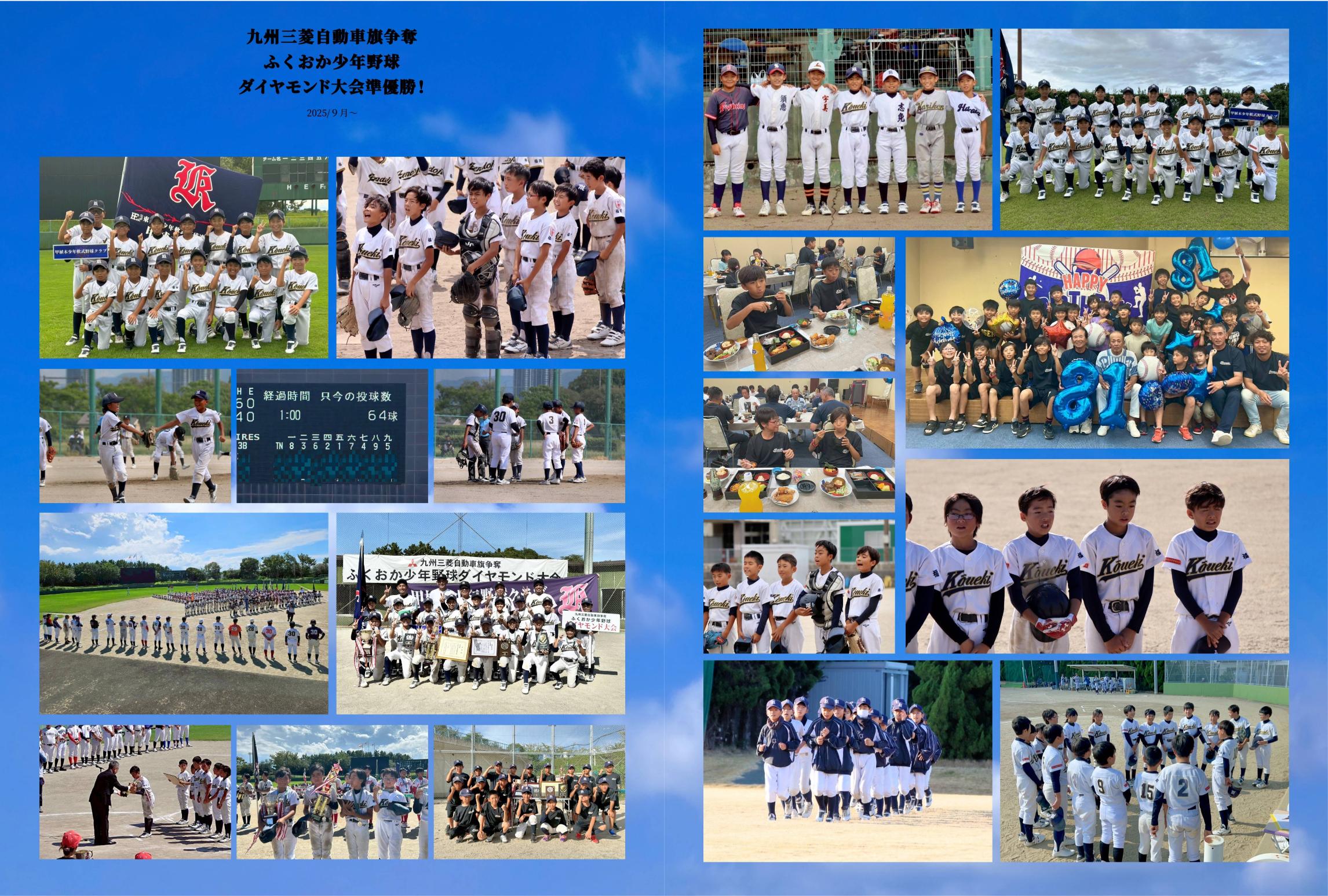 構成は、年間の試合結果を網羅したスケジュールページから始まり、やまもも大会第3位やダイヤモンド大会準優勝といった輝かしい戦績を臨場感たっぷりに再現しています。また、試合中の真剣な表情だけでなく、仲間と囲んだ食事や移動中の無邪気な笑顔など、日常の何気ない一コマも大切に配置し、チームの絆の深さを描き出しました。