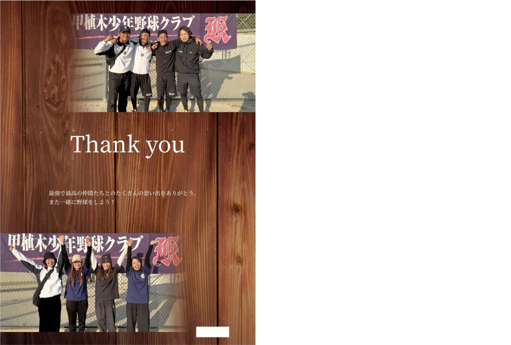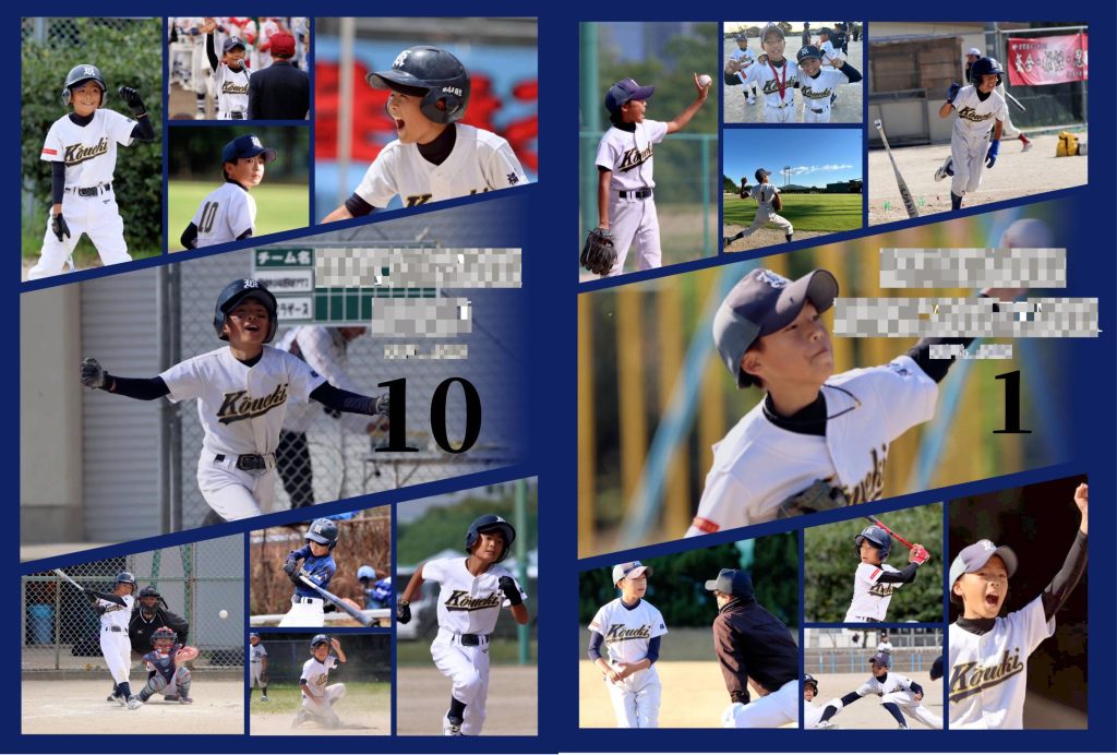 巻末には、下級生からの手書きメッセージや、指導者・保護者の皆様の温かな笑顔を添えた感謝のページを設けています。親子で戦った少年野球の記憶を、いつまでも鮮やかに蘇らせてくれる一生ものの記念となるでしょう。