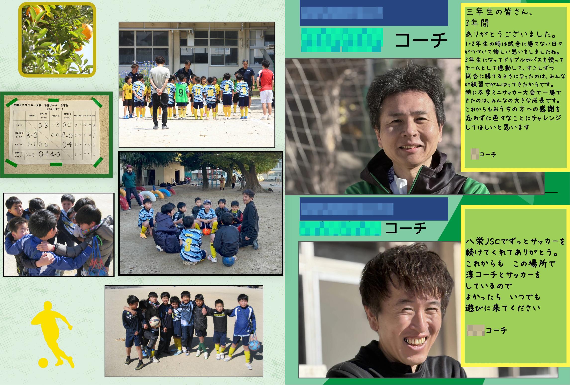 コーチからのメッセージ、そして保護者様から卒団生への応援の言葉で締められているので、この先の未来、もしもサッカーで行き詰まったりしたときはこのアルバムを開いて、「楽しかった」や「うれしかった」を振り返ってもらいたくなるような素敵な気持ちがこもった1冊です。